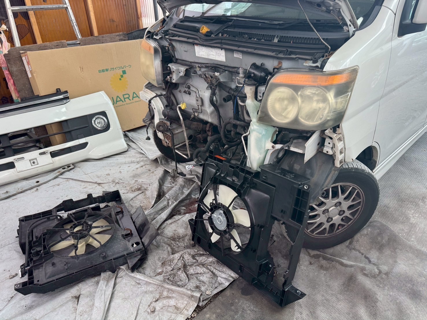 ラジエーターシュラウド(サブタンク一体)の交換及びラジエーターファン&モーターの交換を行い、動作確認後に納車させて頂きました。